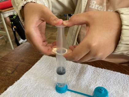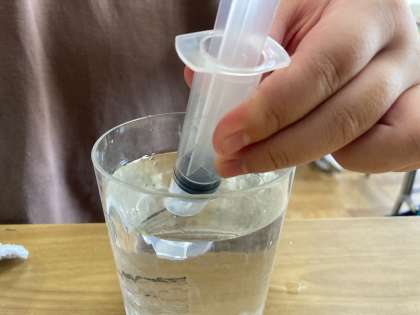 注射器の中にとじこめた水を押すとどうなるのか、実験しました。