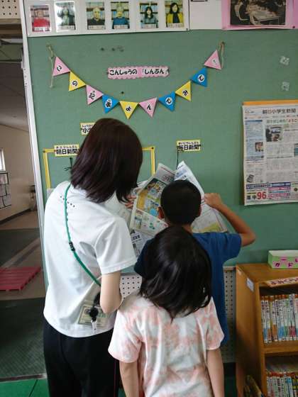 また、図書室には子ども新聞も置かれています。先生と一緒に見て楽しむ低学年の姿が見られました。子どもに興味のある生き物やゲームの記事もよく載っているので、ぜひ、手に取って読んでみてくださいね。