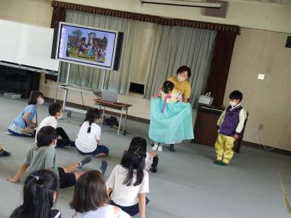 ソンセンニムとの民族体験学習で2年生は、世界の民族衣装について学習しました。日本の民族衣装“着物”のように、世界の国にも大切な民族衣装があり、それらは、踊りとも深い関係があることを学びました。