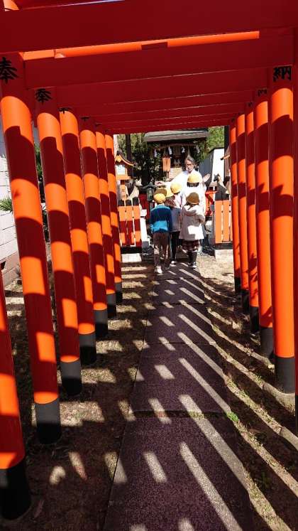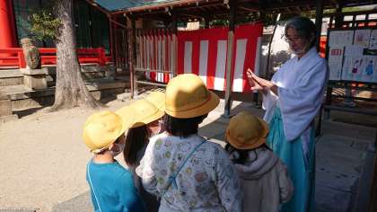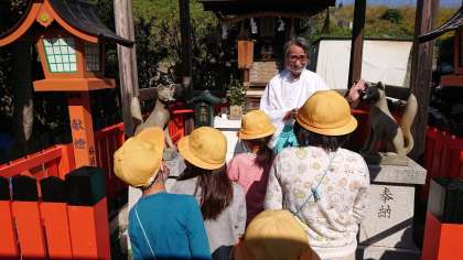 日吉神社は約580年前にはあったこと、おまつりが始まった理由など、子どもたちの説明に対してとても丁寧にお答えいただきました。狛犬や狐の像がある理由について興味津々といった様子で話を聞いていました。