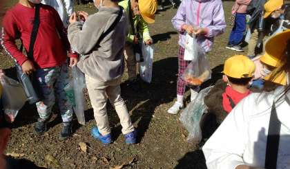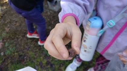 「とても小さいどんぐりを見つけたよ。」「ぼうしつきのどんぐりがあった。」「こっちのどんぐりは丸くて大きいね。」「もみじ、本当に手みたいな形で大きいな。」など、いろいろな秋を見つけることができました。