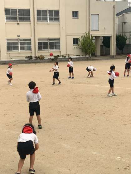 今日は前回に続いて、用具を使う「サルステージ」の動きに挑戦しました。ボールを投げ上げて体に当てて受けとめる動きや、腕を伸ばした状態で頭の上でボールをタッチする動き、二人一組になって息を合わせてボールを投げ合う動きなど、子どもたちはとても楽しそうに取り組んでいました。