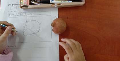 アサガオのように種から育てると思っていた子どももいましたが、チューリップの球根を見せると、「タマネギみたい。」「いや、クリたよ。」「これからチューリップが咲くのか。」と興味津々。「このツンツンした先から芽が出るんだよ。」「タマネギみたいに皮がむけるね。」と、まずはたくさん観察して、観察カードをかきました。