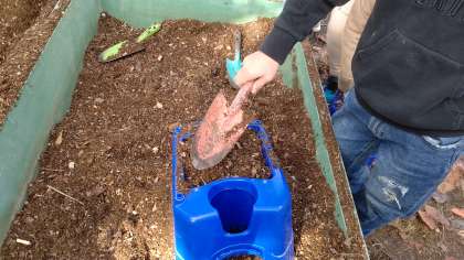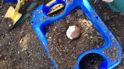 その後、植え方を聞いてから土を移植ごてで入れ、球根を植えました。「ツンツンした方が上だね。」「深いところに埋めないようにしよう。」「土は優しくかけなきゃ。」など、それぞれ注意深く植えることができました。