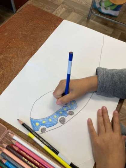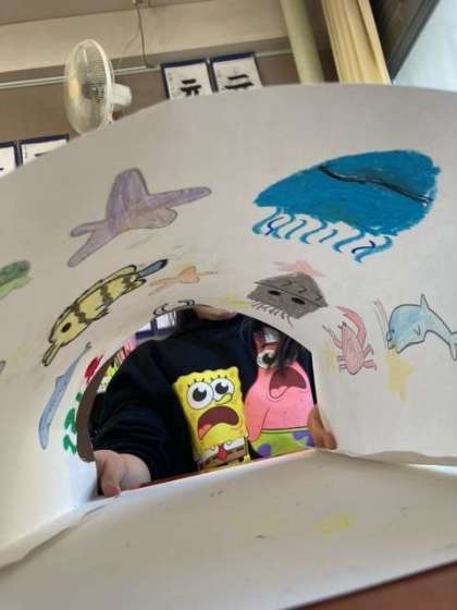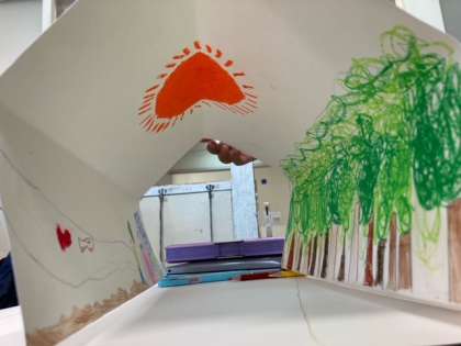 3年生では、画用紙を丸めたり、折ったりしたものを、もう一枚の画用紙の上に立てて、自分だけの世界を想像して作品を作り上げる「立ち上がった絵の世界」に取り組んでいます。どんな作品ができるのか楽しみです。