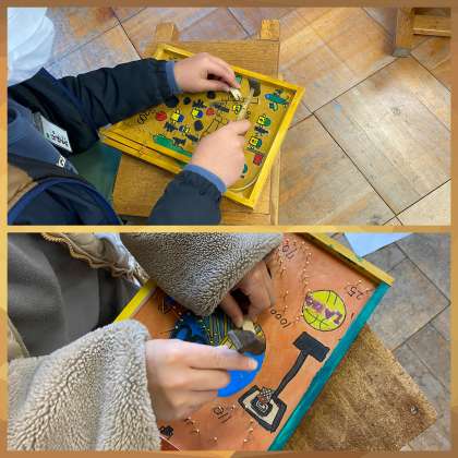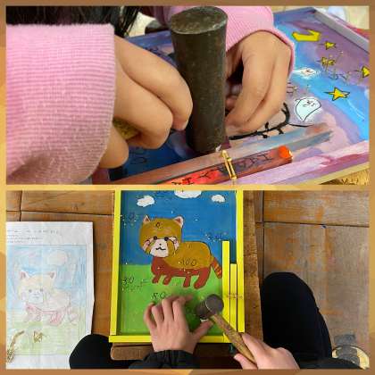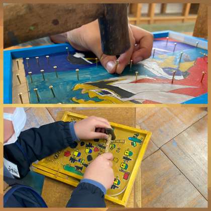 自分たちで考えて作った板に、釘を打っています。試しにビー玉を転がしながら、釘を打つ場所を考えている子もいました。