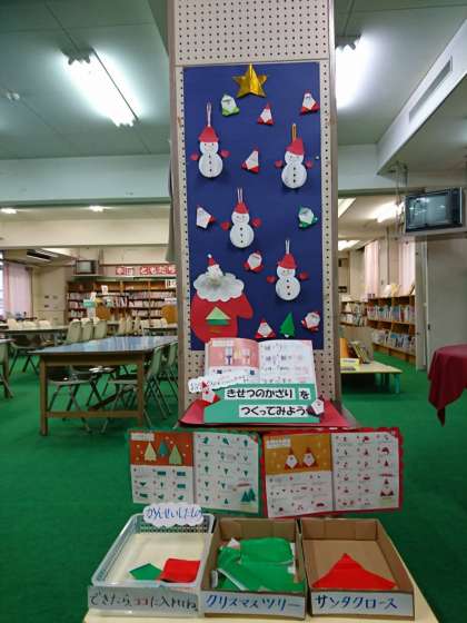 みなさんに作ってもらったかわいいクリスマスの折り紙を、学校図書館司書さんに壁面に飾っていただきました。また、廊下や階段に飾ってあった「みんなのおすすめの本」の掲示物も絵本コーナーに移してもらいました。どの本を読もうかな?と迷ったら、みんなのおすすめの本から選ぶのもいいですね。