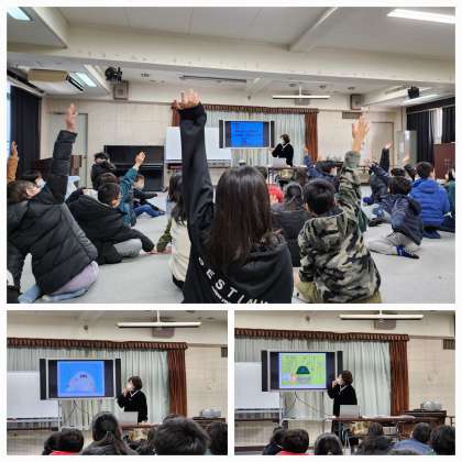 子どもたちは、真剣に話を聞きながら、「なんで?」「それ、聞いたことある」などの反応を見せていました。また、衣食住に関するクイズにもチャレンジしました。近くにある国なのに、まだまだ知らないことたくさんあり、「へぇー」「なるほど!」と楽しく学ぶことができました。