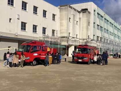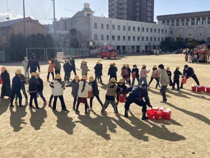 2時間目は、1,2年生が防災クイズ、消防車見学、3、4年生が、水バケツリレー、消火器の使い方、5,6年生は、担架体験、応急手当の仕方を、消防署の方や区役所の方、地域の防災リーダーの方々に教えていただきました。