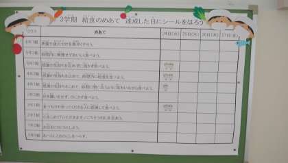 ★楽しい給食にするために、クラスで決めた「給食のめあて」に取り組み、達成できた日は、職員室前の表にシールをはる。