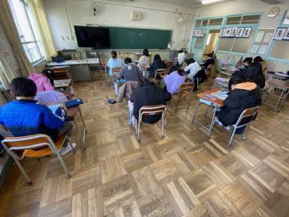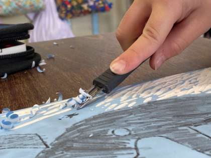 4年生では初めての彫刻刀を使いを練習しながら、木版画に取り組んでいます。