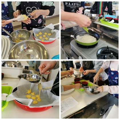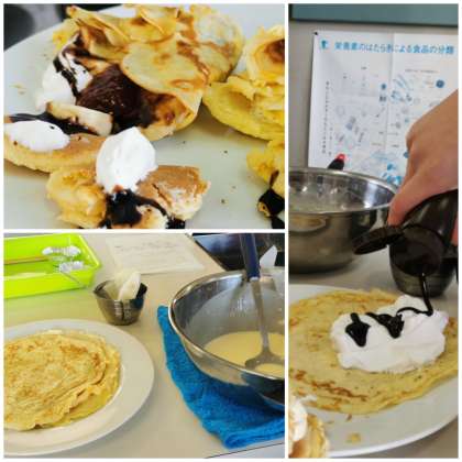 小学校生活最後の調理実習は「クレープ&クッキー」作り!ホットケーキミックスを使って、家でもできる簡単なレシピで作りました。最初はクレープの生地を薄く丸く焼くのに苦戦していましたが、何枚もやっているうちにどんどん上手に!生クリームを泡立てて、ソースをかけて・・・おいしいクレープの完成です。
