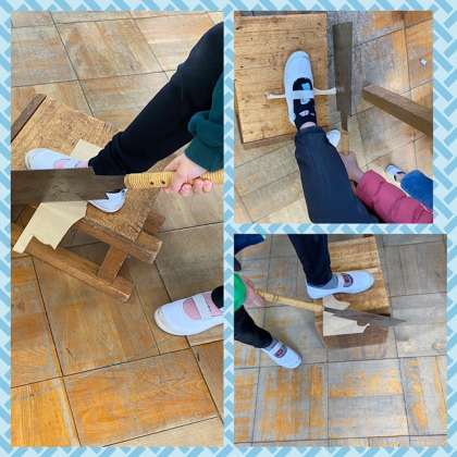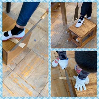のこぎりを使って初めて木材を切りました。