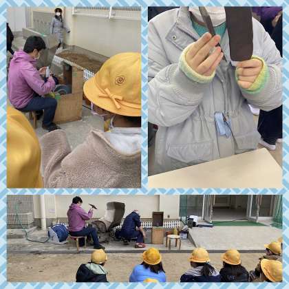 初めに理科室前で、「荒砥ぎ」という工程を実際に見せていただきました。教科書の資料で見るのとは違う迫力で子どもたちは大喜びでした。