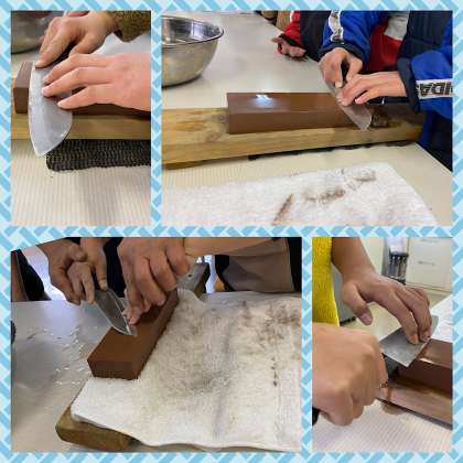 続いて、家庭科室にある包丁を使い、子どもたちが研ぎ体験をしました。そのあと、実際に玉ねぎを切ってみました、切れ味の良い包丁で玉ねぎを切ると、汁が飛ばないので涙が出ないということを体感し、改めて、職人の方々のすばらしさに気づくことができました。