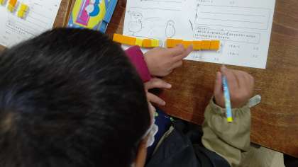 考えた後は、隣の友だちと考えを伝えあったり、前に出て発表したりして、皆で問題を解決しようと頑張っています。