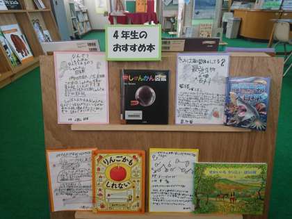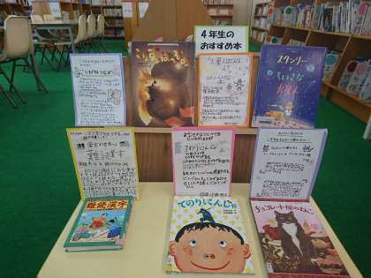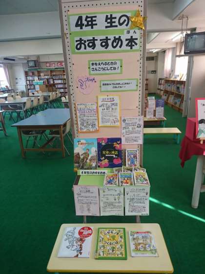 4年生が国語の学習で作成した「おすすめの本紹介」を図書室に展示しています。絵本から自然科学、小説など、バラエティに富んだ内容で、紹介文を読むだけで思わず本を手に取りたくなりますよ。
