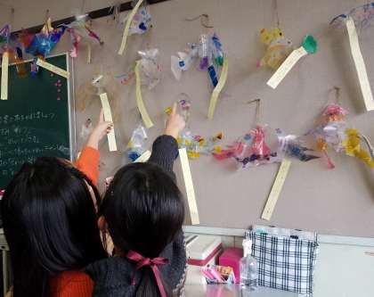 1枚のクリアファイルから生まれた不思議な不思議な生き物、すけるん。できあがったすけるんをみんなで見合いながら、感想を交流しました。