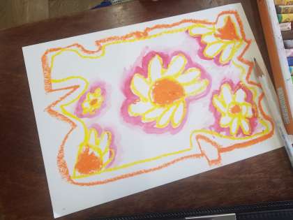 画用紙にパスでお皿を描き、その中にお花を咲かせました。絵の具でお花のまわりに色をのせて、水でにじませると・・・。すてきな色合いのお花のお皿ができました。