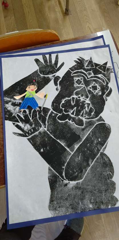 図画工作科では、「かみはんが」に取り組みました。昔話「いっすんぼうし」をテーマに、一寸法師と戦っている鬼を、色画用紙を切り貼りして作り、黒いインクで刷りました。