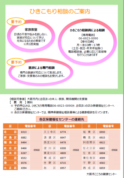大阪市こころの健康センターより、相談窓口についての手紙が届きましたので、お知らせいたします。