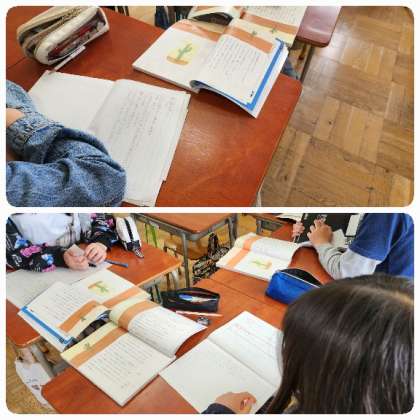 この単元では、朗読会がゴールになります。まずは、物語の感想を交流して、台詞に込められた思いについて考えました。お家でも気持ちを込めて音読するように伝えています。