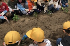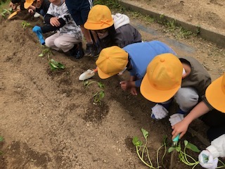 今日は2年生の学習園にサツマイモとオクラ、ピーマンを植えました。みんなで協力して畑を作りました。また、2年生の植木鉢でミニトマトも育てています。大きく育って実がなるのが楽しみですね。