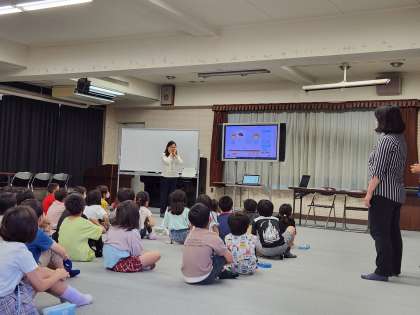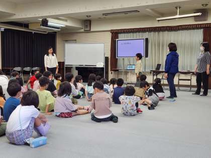 「Hello」「Hello」「What's your name?」「I'm ○○」のやり取りの練習をしたあと、天気の言い方を歌で楽しく学習しました。