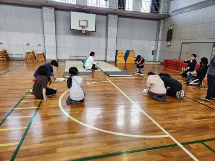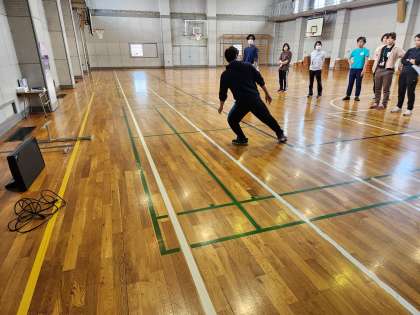 今週は新体力テスト週間です。放課後に、ソフトボール投げと50M走の計測のためのライン引きを行い、ほかの種目の計測の仕方について教員研修を行いました。