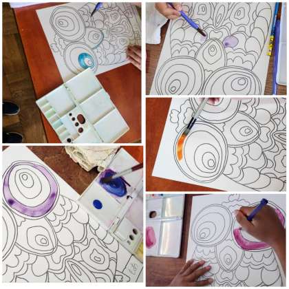 絵の具の混色の練習をしています。