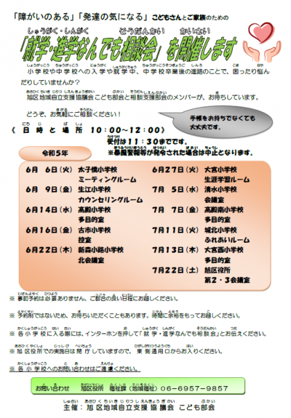 旭区役所より、「就学・進学なんでも相談会」開催のお知らせが届きましたので、お知らせいたします。児童を通じて本日配付しておりますので、ご確認ください。
