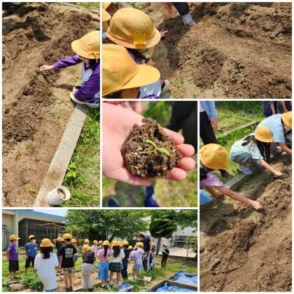 教室で観察していたマリーゴールドとホウセンカの芽を学習園へ植え替えました。