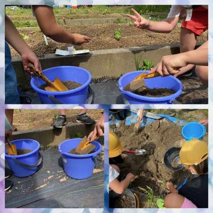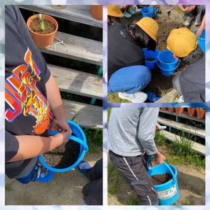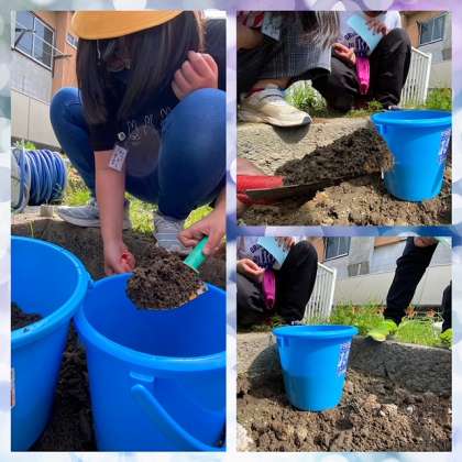 バケツの中に土を入れ、肥料を混ぜ合わせました。土の重さに驚いていました。