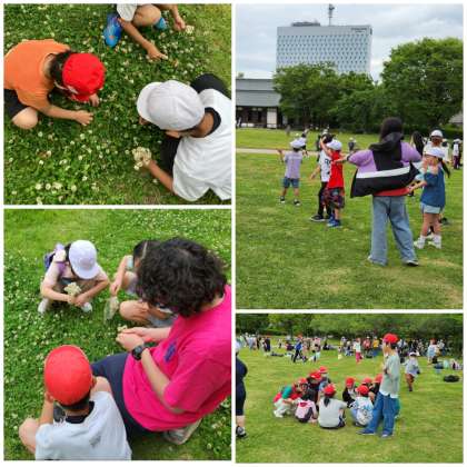 四つ葉のクローバーを探したり、シロツメクサの冠を作ったりしている子もいます。