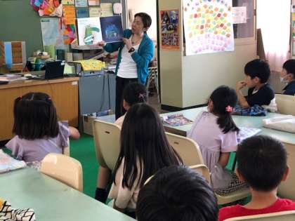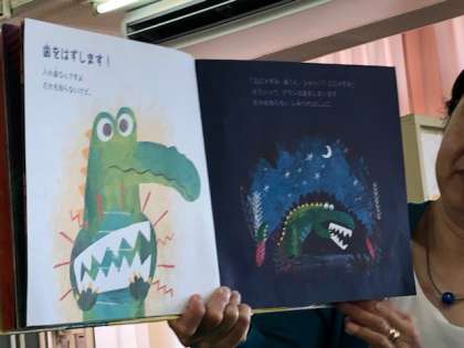 図書の時間はそれぞれの好きな本を読み、また、学校司書さんに読み聞かせをしてもらっています。今日は、「アランの歯は でっかいぞ こわーいぞ」という絵本を読み聞かせしてもらいました。こわーいワニの一族のアランのかわいいお話です。