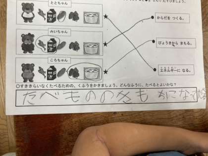 紙芝居の形でお話を聞き、好き嫌いせず食べることの大切さについて考えたり、ワークシートを使用して、好き嫌いなく食べるための工夫を自分なりに考えたりしました。