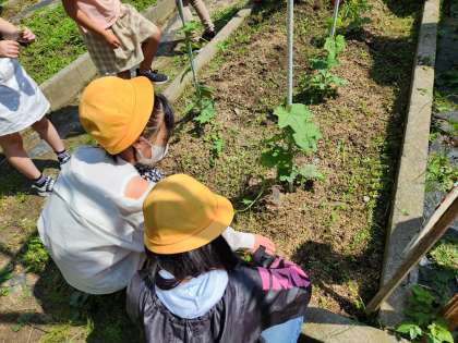 春に植えたヘチマやゴーヤがぐんぐんつるをのばして生長しています。
