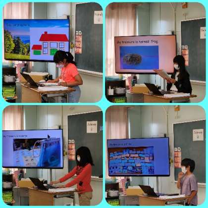 「What is my treasure?」をテーマに発表を行いました。スライドを使って、お家で撮ってきた宝物を見せてくれました。宝物への思い入れや特徴を英語で説明できました。