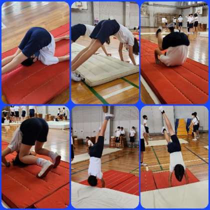 ウォーミングアップの後、前転・後転、開脚前転・後転の練習に取り組みました。倒立にもチャレンジしています。