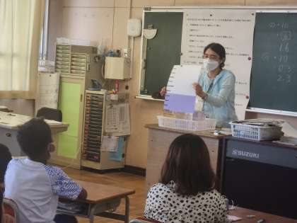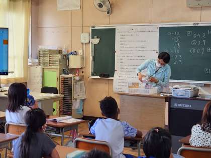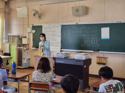 3年生で学習した内容を振り返った後、先生が用意した色水は何Lなのかを考えました。