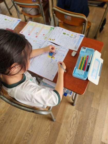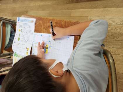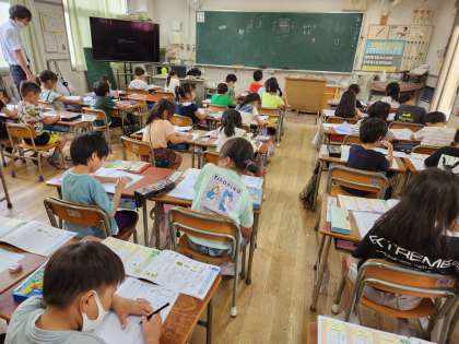 「一」という漢字は「いち」と読みますが、「一つ」と書くと「ひとつ」と読みます。送り仮名によって、読み方が変わるのは、一年生にはなかなか難しいことなのですが、教科書の詩の学習を通して、読み方にも慣れていってほしいと思います。