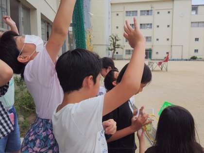 クラスのみんなで空高く飛んで行くチョウを見送りました。