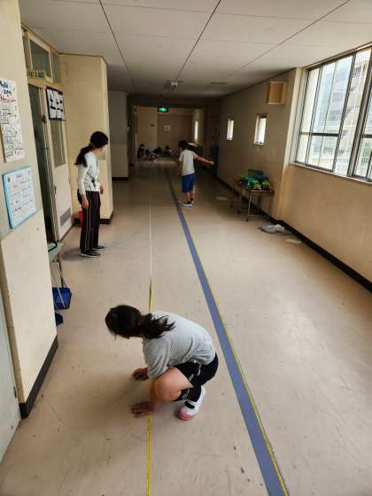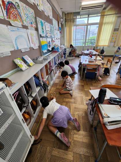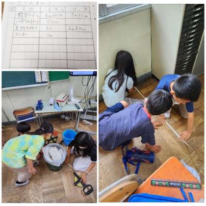今日は巻き尺を使って、身の回りのものの長さを測りました。グループで協力して、巻き尺を押さえたり、めもりを読んだりしていました。