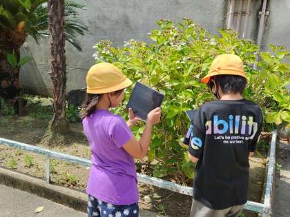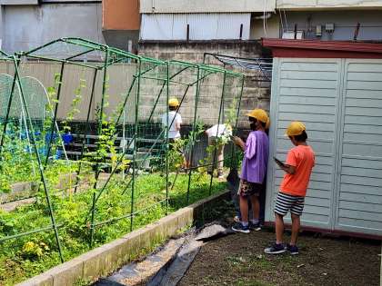 タブレットで写真を撮り、植物たちは夏を迎えて、春の様子と変わっていることを観察しました。