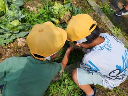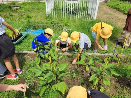 学習園に植えたナスが元気に育っています。大きなナスができるように、みんなで草抜きをしました。