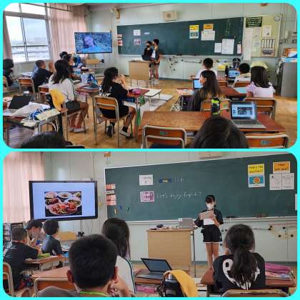 外国語の時間に、5・6年生で英語で交流会を開催しました。一緒に歌を歌ったり、名前や誕生日、好きなものを交流したりしました。6年生は、スライドを使って、行ってみたい国について紹介しました。