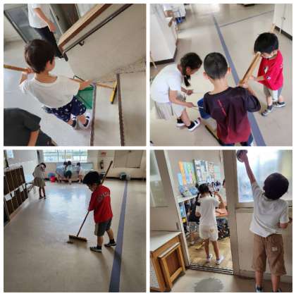 隅々まで掃いてごみを集めたり、みんなで協力してちり取りでごみを取ったりしていました。