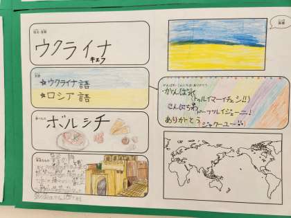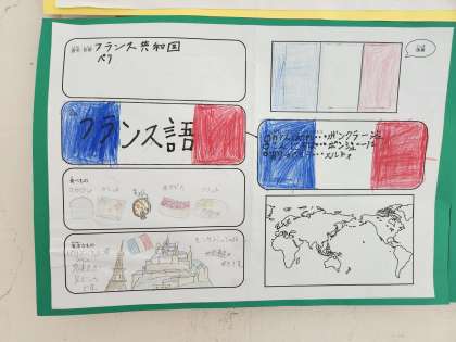 1年生が国旗カルタで国を選び、カルタに書かれている国名と首都は2年生が、国旗は3年生が、言葉やあいさつは4年生がまとめました。高学年は自分達で調べて、5年生が食べ物を、6年生が有名なものや場所をまとめました。
