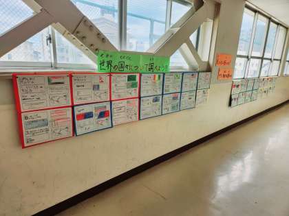 朝の英語学習タイムを使って、各学年で取り組んでいた『世界の国調べ』の掲示物が完成し、三号館二階に掲示しています。