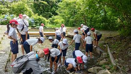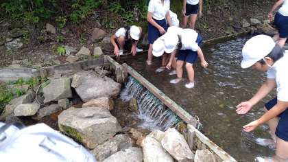 川の水の冷たさとたたかいながら、魚つかみ開始です。